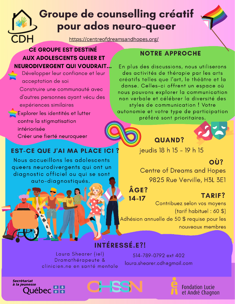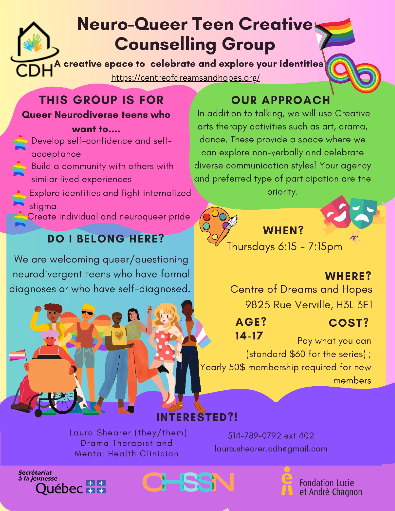 In addition to talking, we will use Creative arts therapy activities such as art, drama, dance. These provide a space where we can explore non-verbally and celebrate diverse communication styles! Your agency and preferred type of participation are the priority.