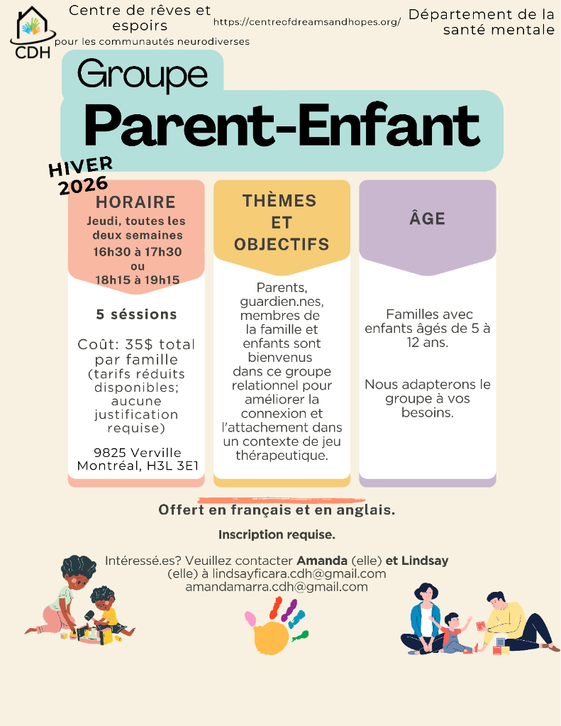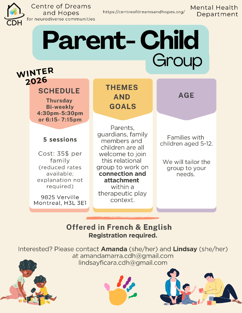 Parents, guardians, family members and children are all welcome to join this relational group to work on connection and attachment within a therapeutic play context.